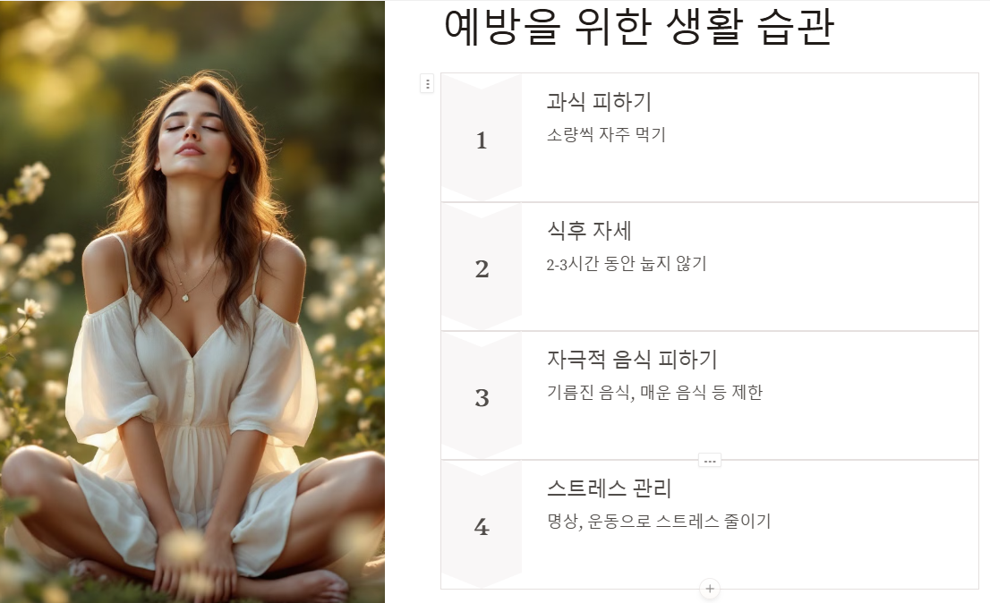 - 식사 후 바로 눕지 않기: 식사 후 2~3시간 정도는 눕지 않도록 하고, 자는 동안 상체를 높여주는 것이 도움이 됩니다.