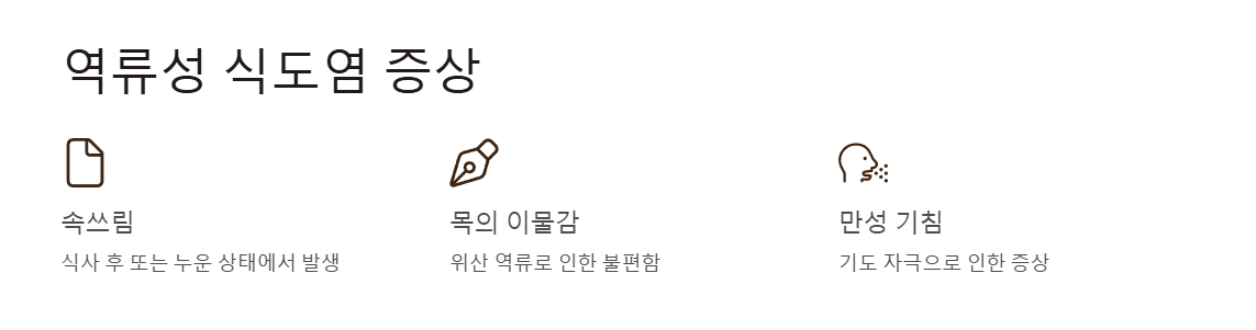 - 속쓰림: 식사 후 또는 누운 상태에서 발생하는 타는 듯한 가슴 통증