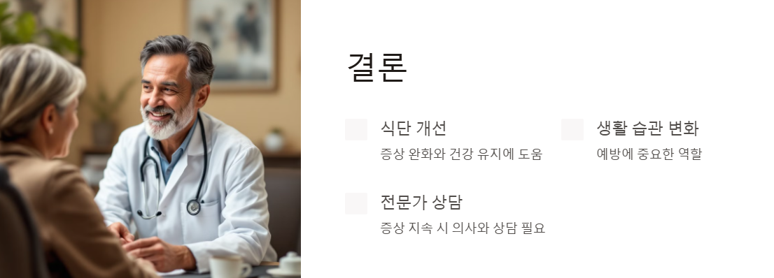 역류성 식도염은 음식과 생활습관 개선으로 충분히 관리할 수 있습니다. 위에서 소개한 역류성 식도염에 좋은 음식을 일상 식단에 적절히 포함시켜, 증상을 완화하고 건강을 유지할 수 있습니다. 과식이나 자극적인 음식을 피하고, 스트레스를 줄이며 규칙적인 생활을 하는 것도 중요한 예방 방법입니다. 증상이 지속되거나 심해지면 전문가와 상담하는 것이 좋습니다.