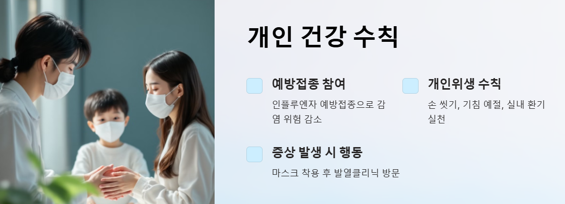 - 예방접종 참여: 인플루엔자 예방접종을 통해 감염 위험을 낮추세요.