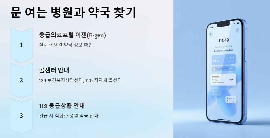 - 콜센터 안내: 129 보건복지상담센터 또는 120 지자체 콜센터를 통해 가까운 병원과 약국 정보를 문의할 수 있습니다.